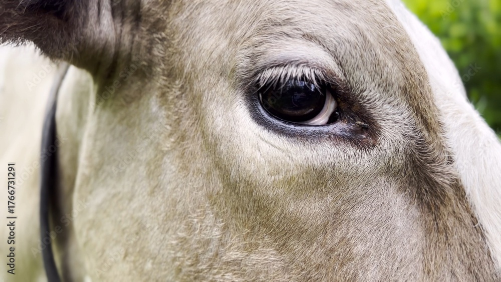 Close up to eye of cute gray cow at lawn. Sight of a friendly mammal animal at countryside. Profile of beautiful kine grazing outdoor. Cattle on pasture. Concept of livestock husbandry #1766731291