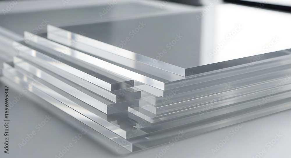 Close-up view of multiple stacks of clear, transparent acrylic or plexiglass sheets, showcasing their smooth surfaces and varying thicknesses, ready for industrial use. #1696965847