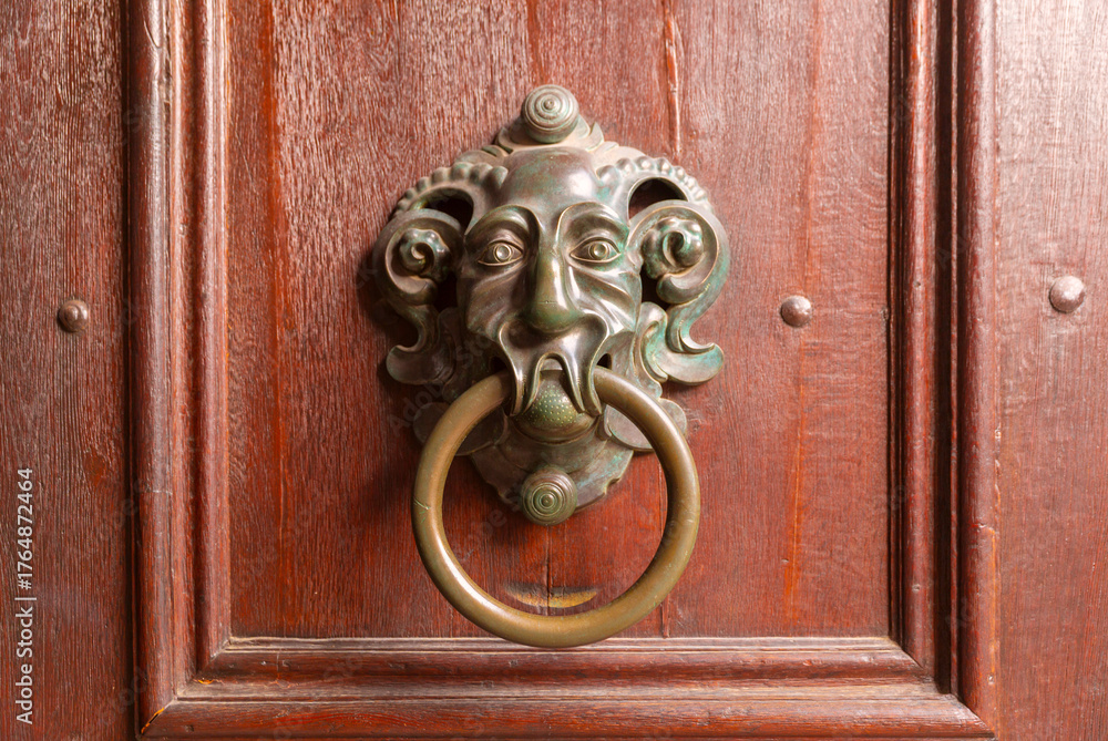 Closeup of decorative metal door knocker on wooden door in Rothenburg ob der Tauber Germany #1764872464