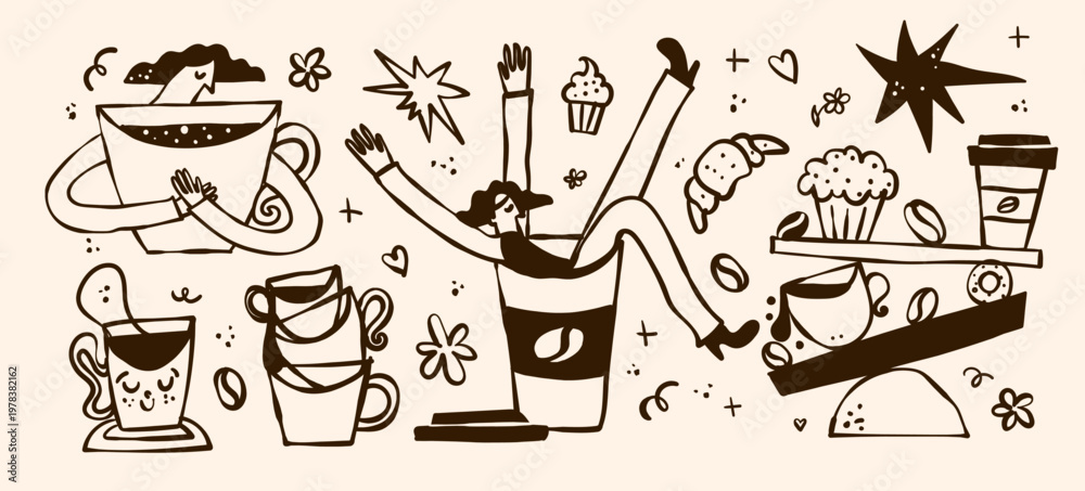 Coffee and cafe culture naive lifestyle bold vector isolated cute illustrations of people with coffee cups beans croissant muffin and cupcake for sticker print and branding #1978382162