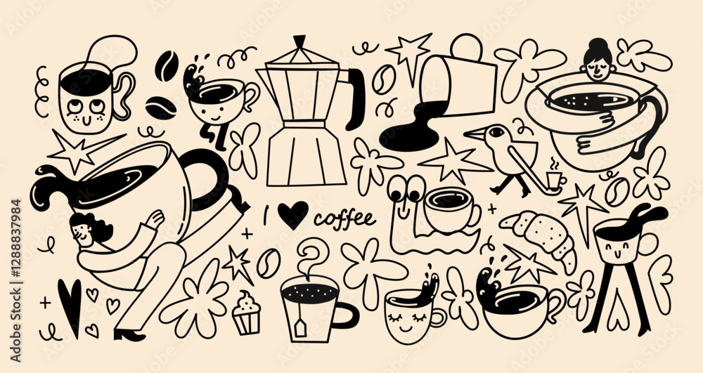 Coffee house, cafeteria, cafe stickers with cute lettering quotes, mugs and takeaway cups vector illustration set isolated on the background. Menu design elements, logo and badges collection #1288837984