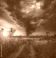 Collage, not AI. Tornado, typhoon or storm with thunderclouds over a rural road. Evening view of sunset and pre-stormy sky. Weather theme background. #1692002755