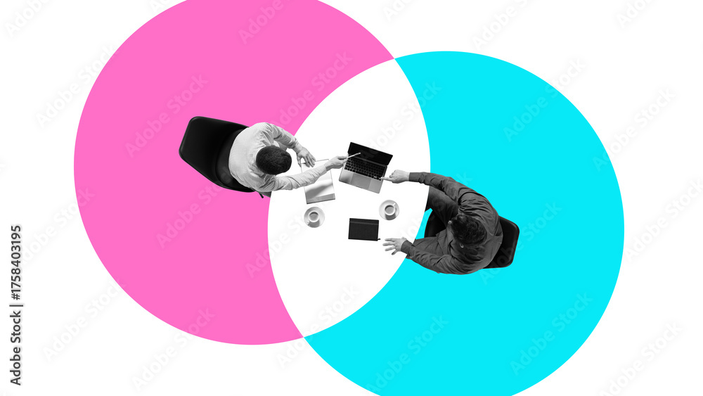 Collage with business partners discussing ideas over colorful overlapping circles symbolizing cooperation. Concept of leadership communication, corporate development, and educational presentation. #1758403195
