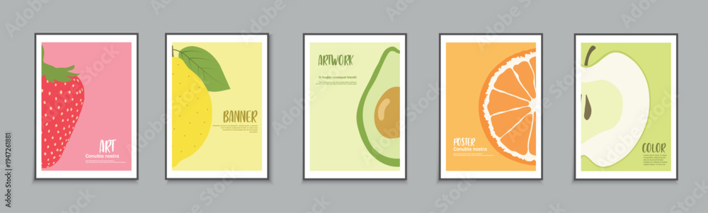 Collection of colorful summer posters, templates, backgrounds placards, brochures, banners, flyers and etc. Bright fruits artwork covers. Vibrant tropical cards #1947261881