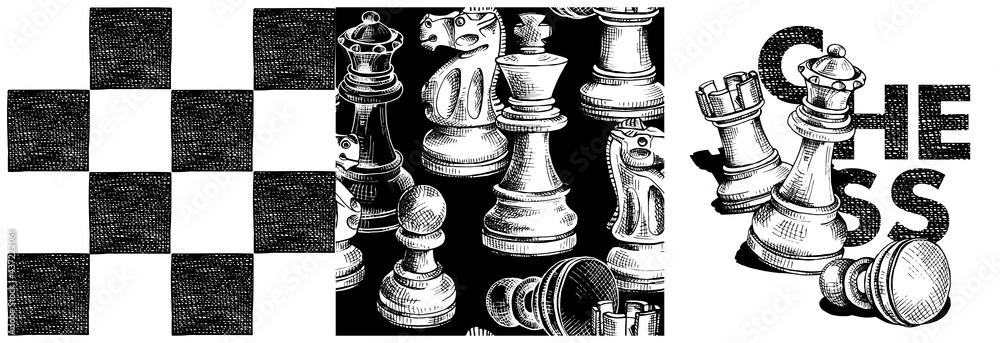 Collection of print and seamless pattern. Chess figures on a checkered background. Textile composition, hand drawn style print. Vector black and white illustration. #437222061