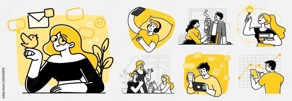 Collection of scenes at office. Bundle of men and women taking part in business meeting, negotiation, brainstorming, talking to each other. Outline vector illustration in cartoon style. #283386878