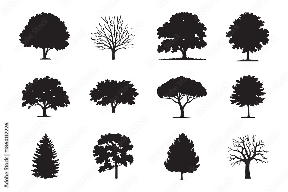 Collection of twelve different tree silhouettes vector illustrations showing various species including deciduous coniferous and bare winter trees #1860112226