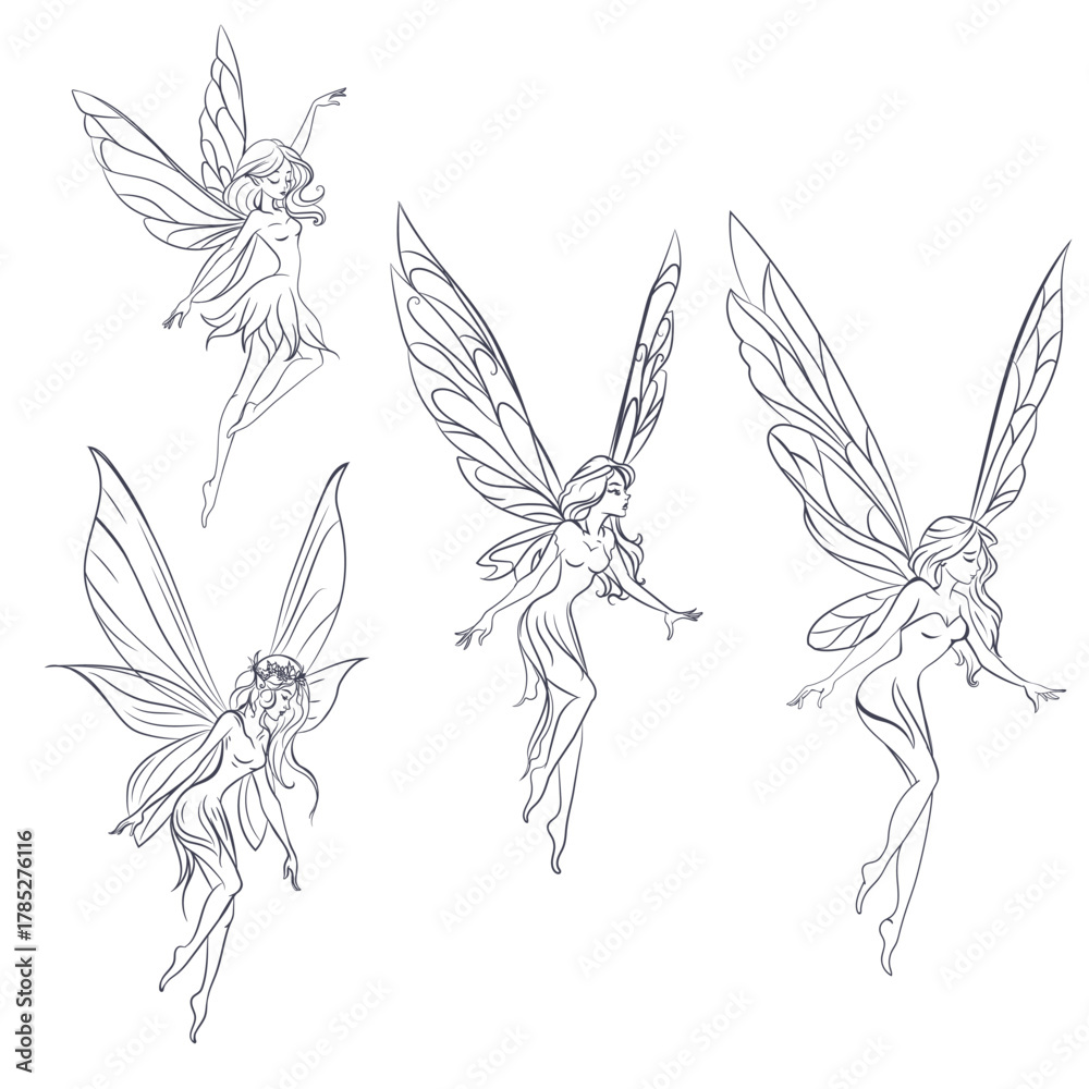 Collection of vector lined beautiful fairy nymphs in elegant style #1785276116
