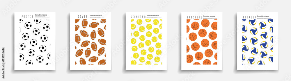 Collection of vector posters, brochures, cards with sports balls - basketball, volleyball, tennis, soccer and American football. Artwork sport games covers, prints, patterns for your design and ideas #1798136444