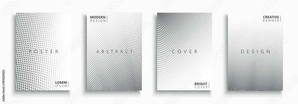 Collection of vector white and gray digital halftone templates, posters, placards, brochures, banners, flyers, backgrounds and etc. Contemporary striped and dotted abstract covers - geometric design #1914205825