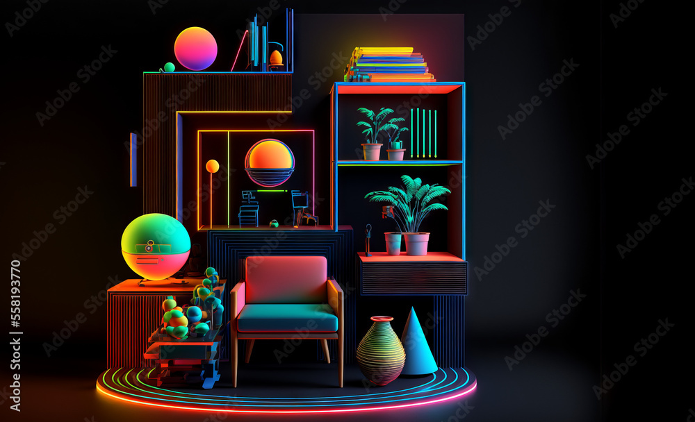 Colorful Abstract arrangement of furniture and geometric shape on a black background. generative ai #558193770