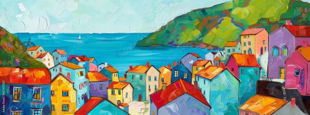 Colorful coastal town with houses painted in bright hues overlooking the sea generated by AI #837613052