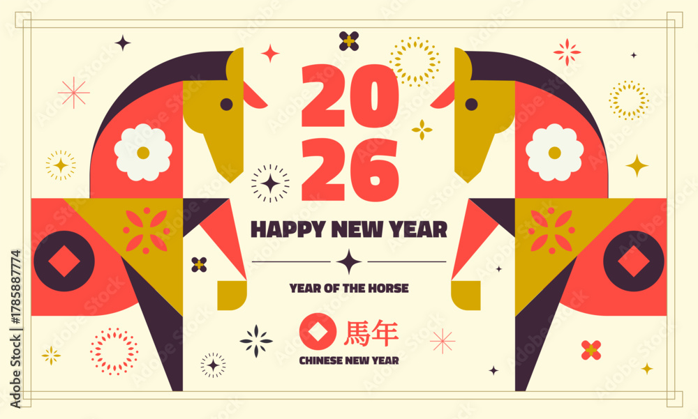 Colorful flat geometric illustration celebrating the 2026 Chinese New Year – Year of the Horse. Features a stylized horse composed of geometric shapes with festive lanterns. Vector illustration #1785887774