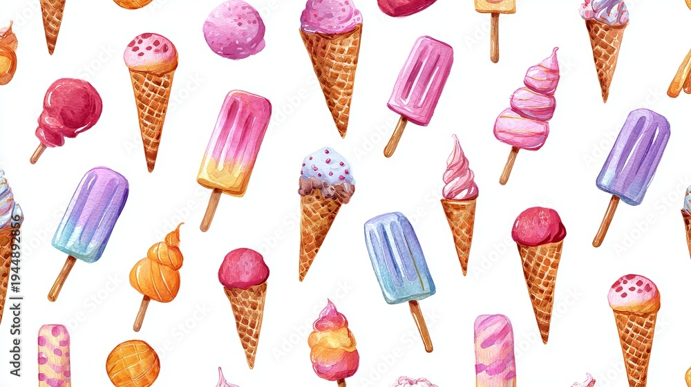 Colorful ice cream cones and popsicles make a seamless pattern on white. This design is perfect for summer treats and prints. #1944892856