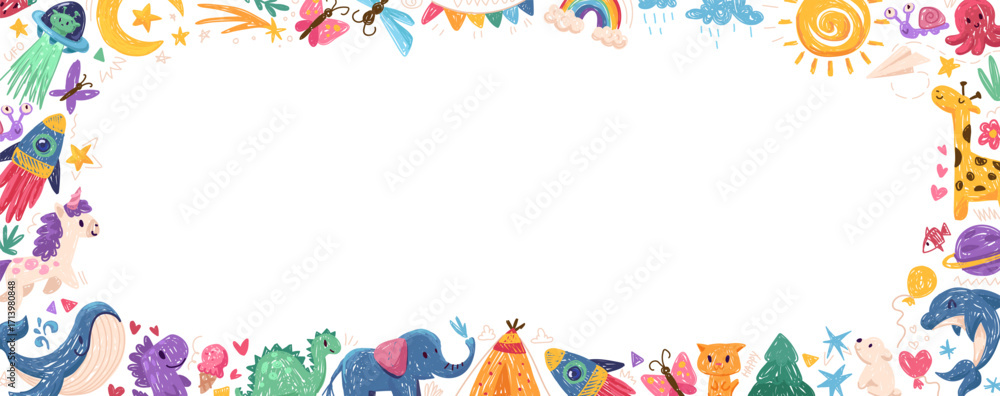 Colorful kid crayon frame with animal doodles drawn by colorful crayons. Childlike border with pencils and childish drawings on paper. Vector illustration for certificate, diploma, poster, bg #1713980848