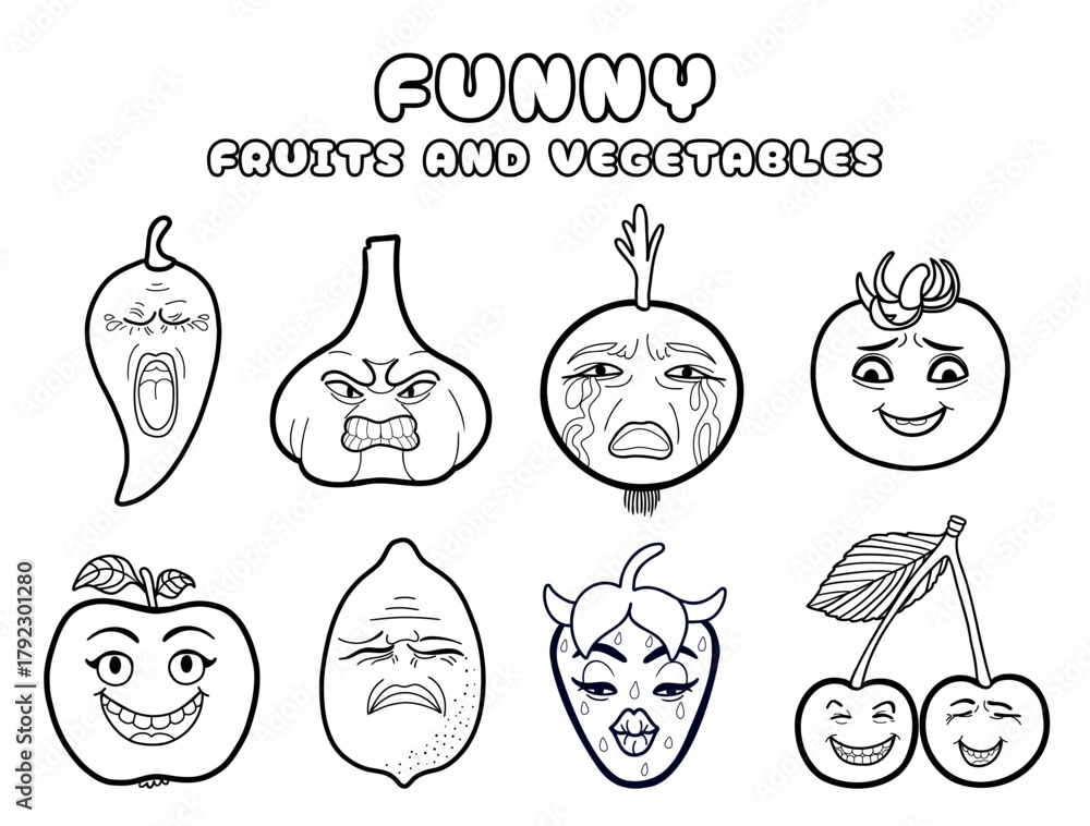 Coloring set Funny fruits and vegetables with emotions. Fruits and vegetables with faces. Set of mascots with outline. Cartoon flat style. #1792301280
