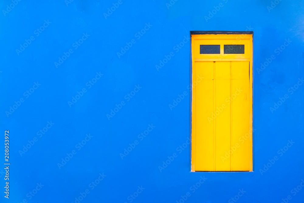 Colourful colonial Caribbean tropical style blue facade closed window in a bright and intense blue wall house background. #208053972