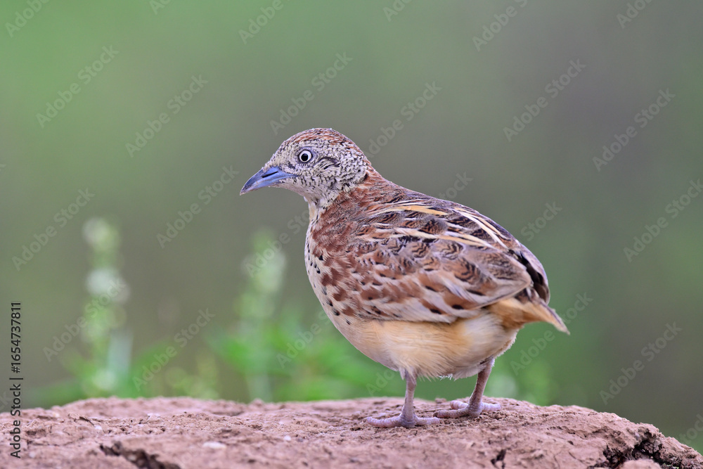 common buttonquail stunning standing over dirt hill expose to soft light in meadow, exotic rare resident bird of Thailand #1654737811