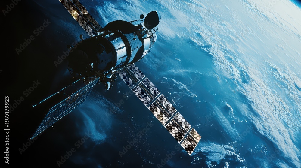 Communication satellite flying above earth, collecting solar energy for vital global communication, broadcasting, data transmission, and weather monitoring, enabling universal access to information #1977179923