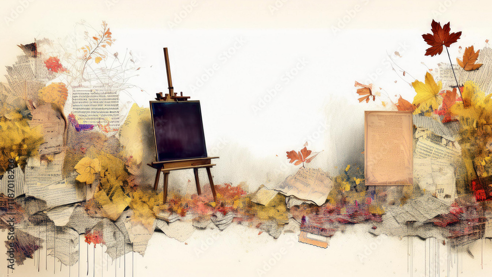 Composición artística con caballete y elementos de arte y otoño #1187018266