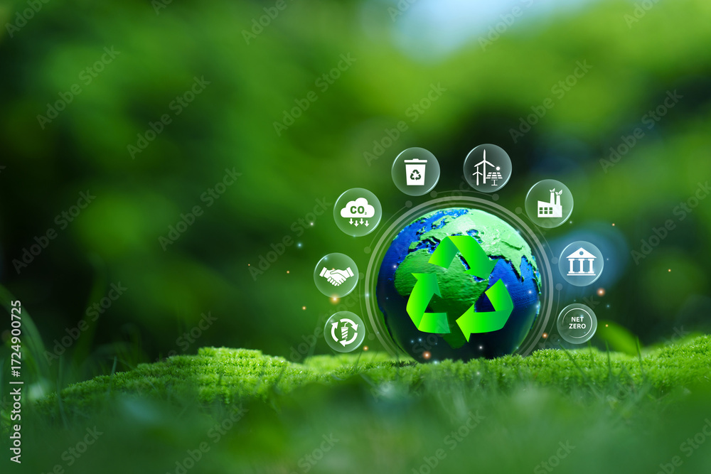 Concept for Earth Day, Renewable Energy, Sustainable Environment, Reuse Reduce Recycle, Ecosystem, Zero waste, Net zero, CSR, ESG. Green earth with Recycle sign in green bokeh background. #1724900725