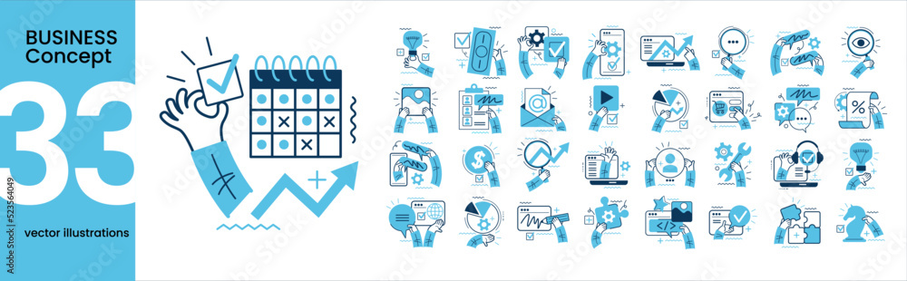 Concept illustration set. Collection of different business concept scenes and situations. Human hands with icons and images. Taking part in business activities, digital marketing, business concept #523564049
