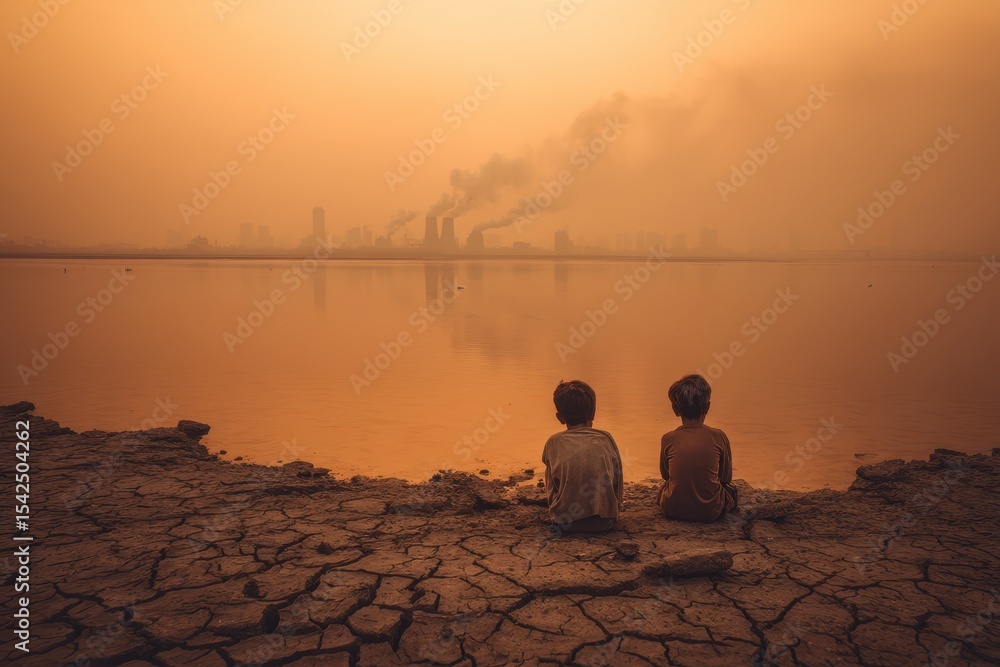 Concept of climate change and global warming Kids by a drying lake under an orange sky due to pollution #1542504262
