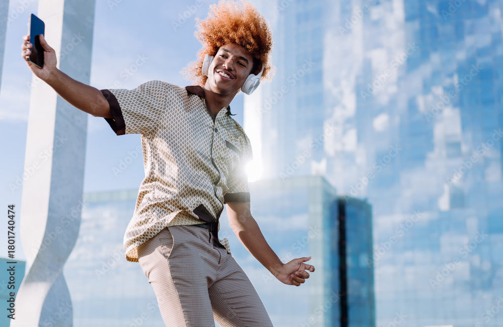 Confident African American man with red afro wearing wireless headphones, smartphone in hand, enjoying music, symbolizing personal freedom, relaxation, and technology-driven lifestyle outdoors. #1801740474
