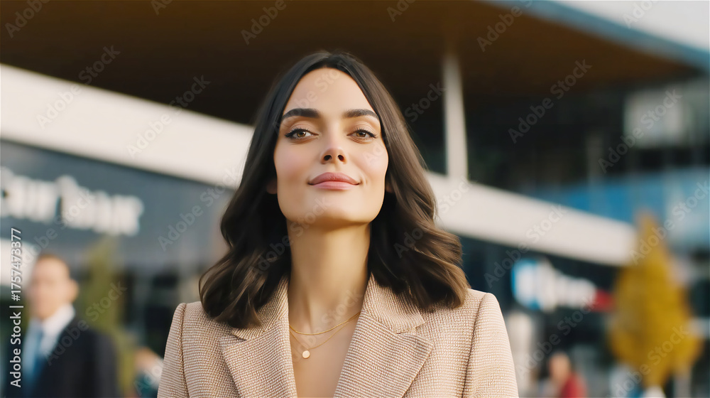 Confident woman standing outdoors in sunlight near modern building, concept of success, confidence, and urban lifestyle. #1757473377