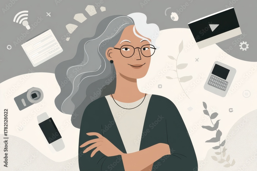 Confident Woman Surrounded by Modern Technology Icons in Minimalist. #1782128022