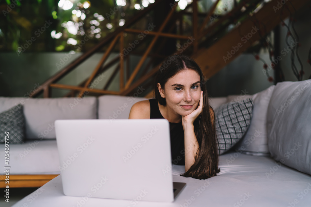 Confident young Caucasian freelancer with long hair working remotely on laptop, smiling thoughtfully while lounging on sofa, representing balance between productivity and comfort. #1754397736