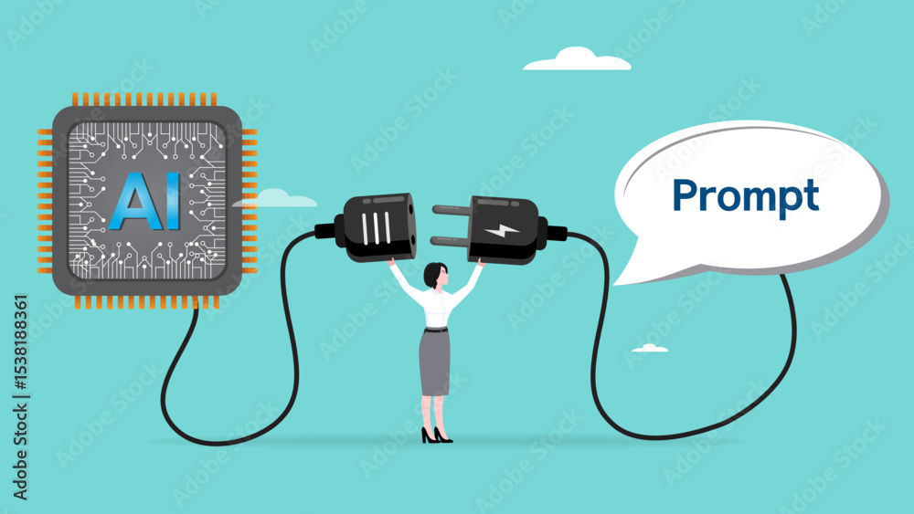 connecting prompts with AI chips to help get the job done, AI in companies to increase efficiency, businesswoman connect speech babble with AI chip idea to money concept vector illustration #1538188361