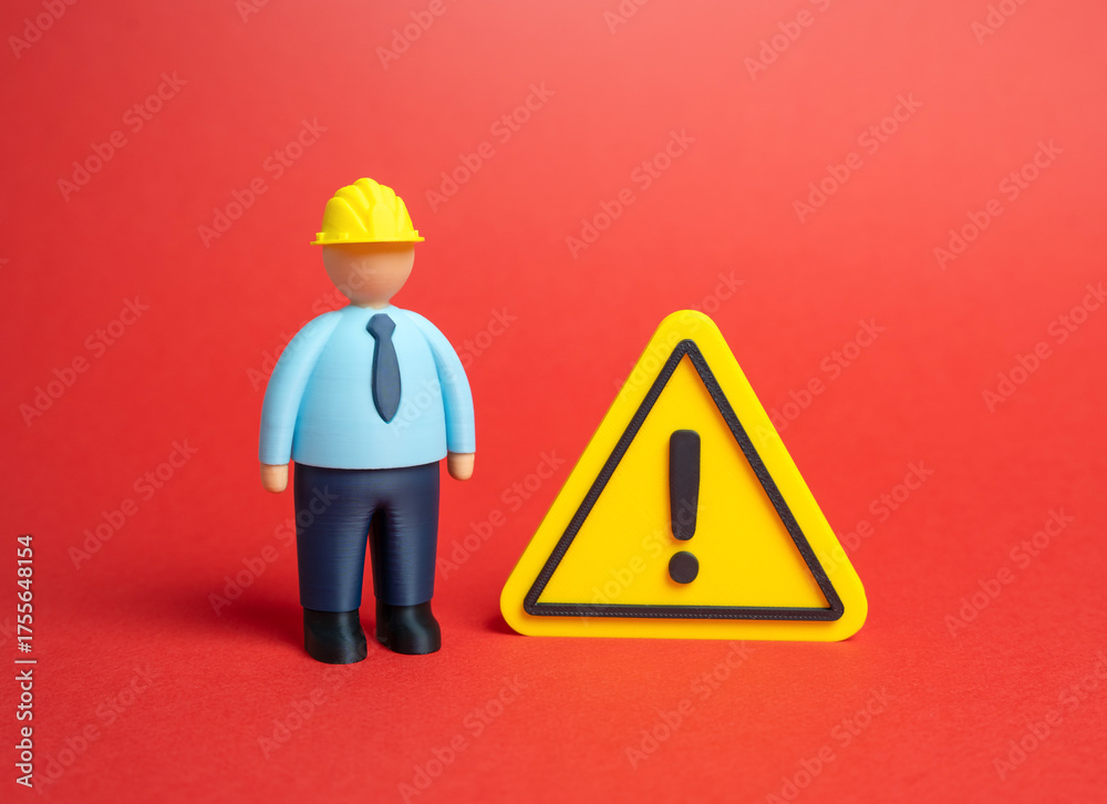 Construction worker and hazard warning sign. Safety precautions. Construction and repair, critical building structural defects. Industrial problems. Inspection, prevention of accidents #1755648154