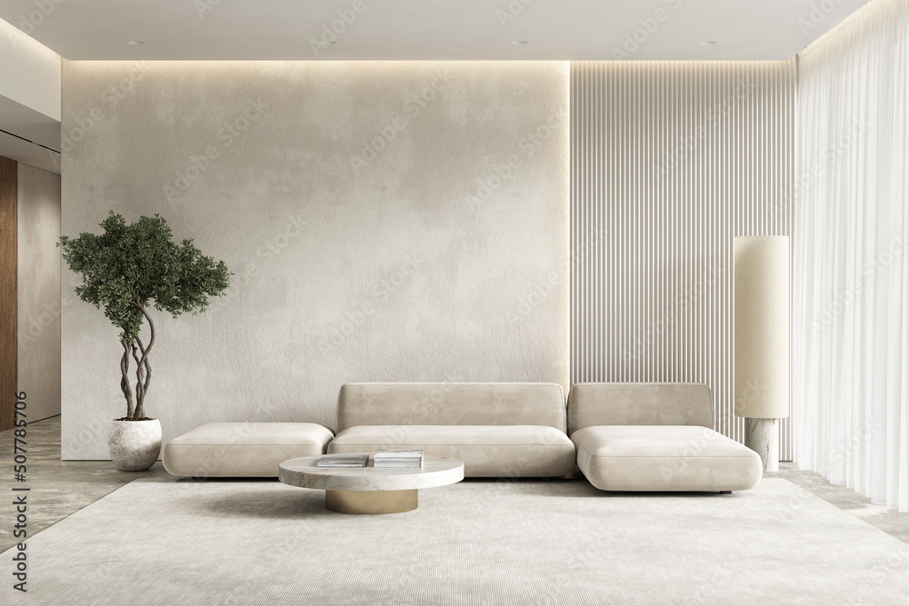 Contemporary interior with sofa, wall panel and decor. 3d render illustration mockup. #507785706