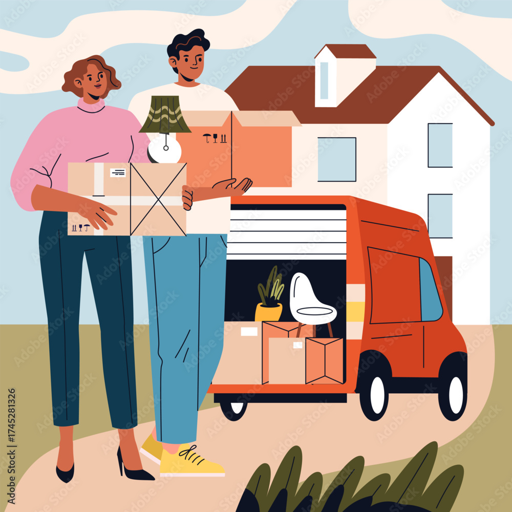 Couple Moving Home Unloading Boxes Illustration #1745281326