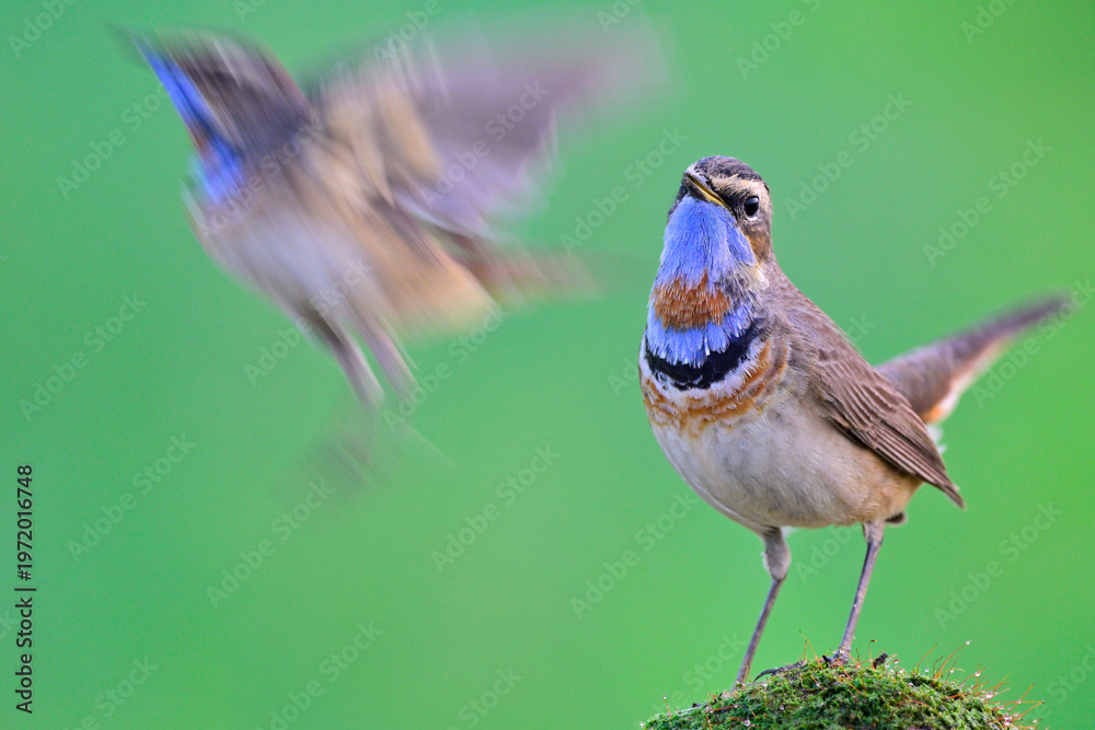 couple of bluethroat, beautiful birds, fighting for their meals while foraging in early morning #1972016748