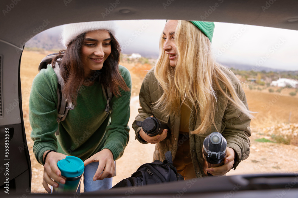 Couple travelling while getting their backpacks from the trunk of their car #553855533