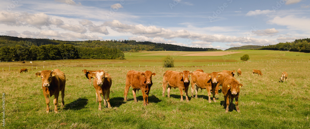 Cows on the meadow looking at the camera during sunny day in the countryside #1743672736