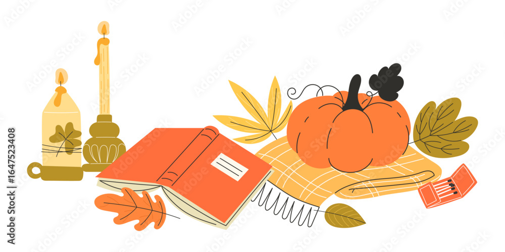 Cozy Autumn Fall Illustration with Pumpkins Candles Book and Autumn Leaves in Flat Style for Seasonal Banners Greeting Cards and Thanksgiving Holiday Home Decor #1647523408