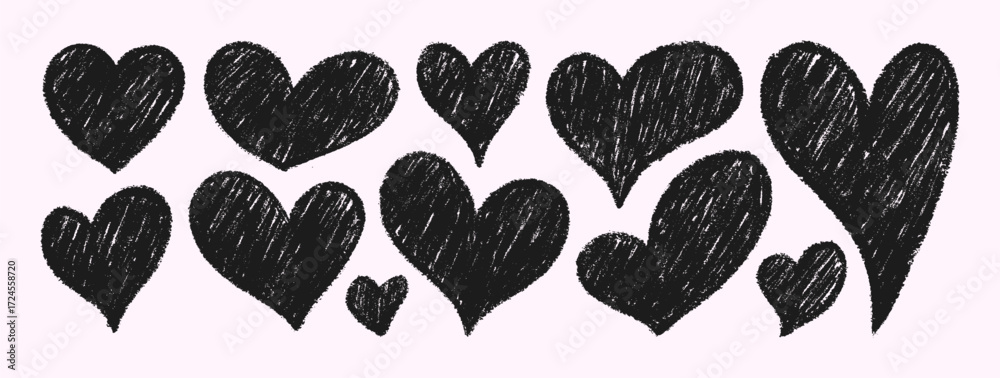 Crayon Doodle Hearts. Vector Chalk and Pencil Heart Shape in Black Color. Hand Drawn Love Icon Set in Kids Style for Web Design, Patterns, Logos, Valentines Day Cards #1724558720
