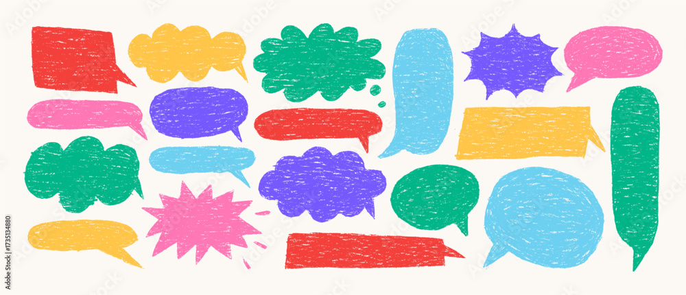 Crayon Speech Bubble Frame. Vector Hand Drawn Text Box of Pastel Colors. Chalk Talk Balloon in Comic Retro Style. Kids Doodle Dialog Chat #1735134880