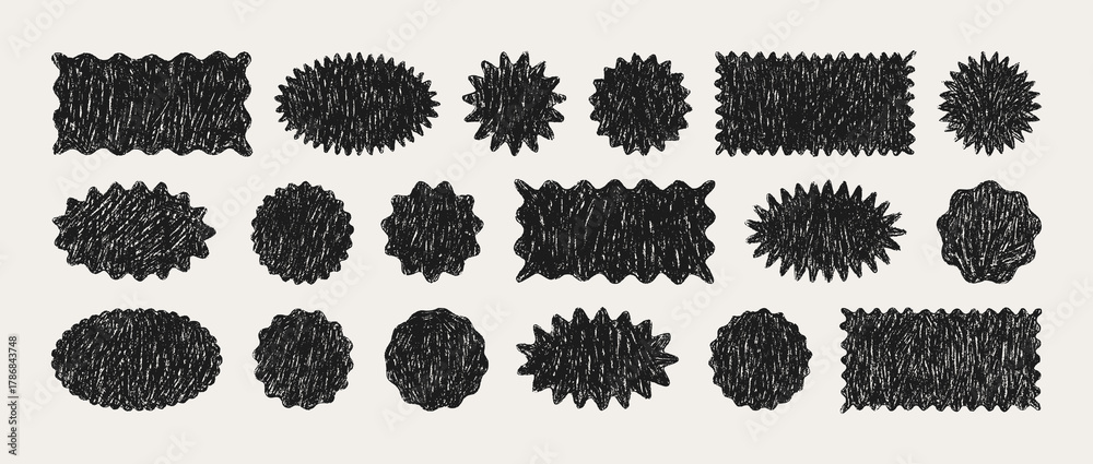 Crayon Stamp Stickers Set. Vector Hand Drawn Chalk Zig zag Wavy Badge Rectangle, Oval, Circle. Geometric Shapes in Retro Style. Doodle Abstract Elements for Frame, Stamp, Template #1786843748