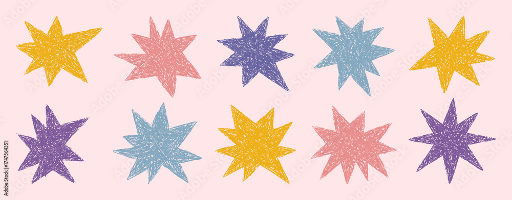 Crayon Stars Shapes Set. Vector Hand Drawn Chalk Funky Groovy Sparks Forms in Retro Style. Kids Doodle Abstract Elements for Patterns, Stickers , Badges, Posters, Web Design. #1747564351