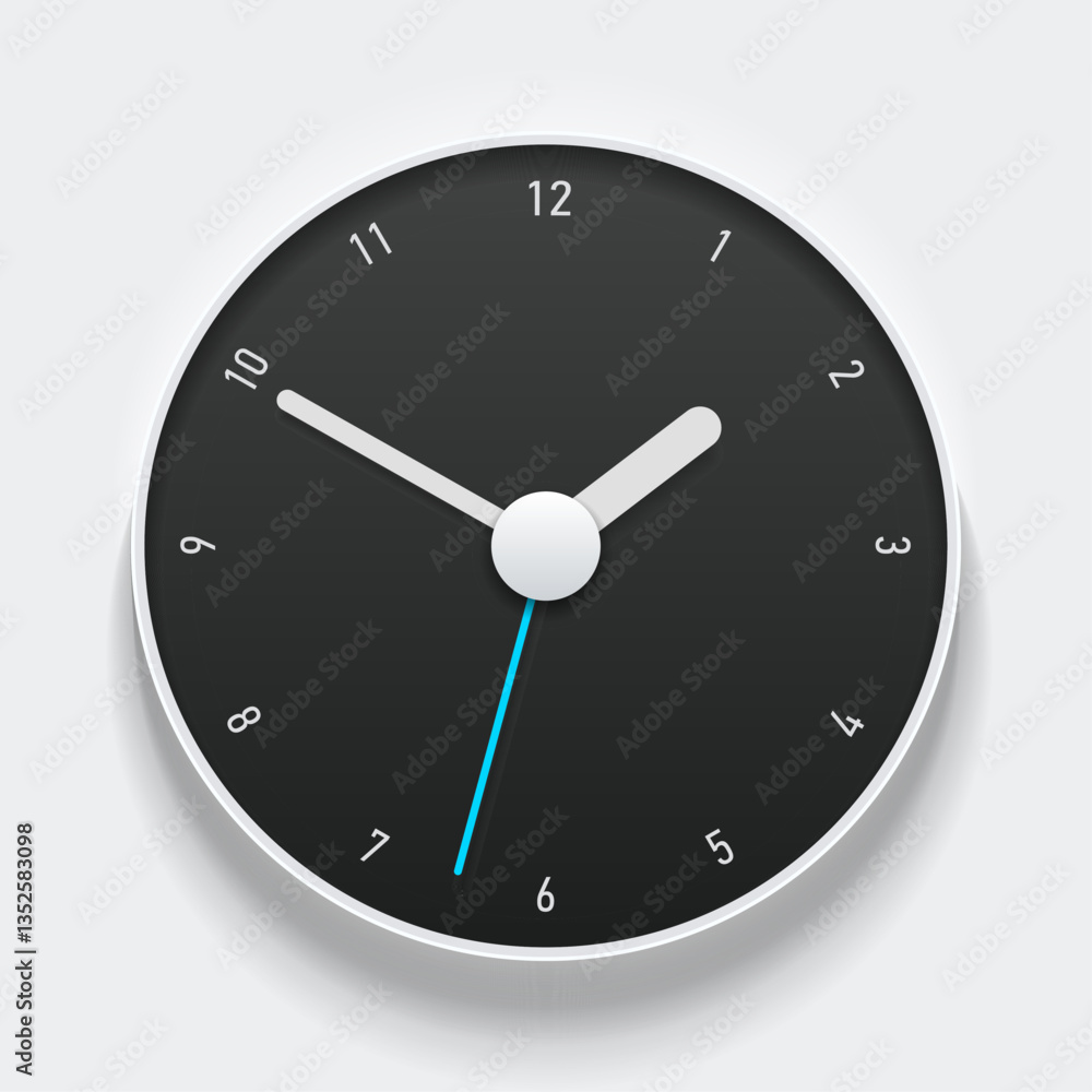 Creative black clock in realistic flat style, with color arrow and numbers. Watch on white background. Business time. Vector design element for you project #1352583098