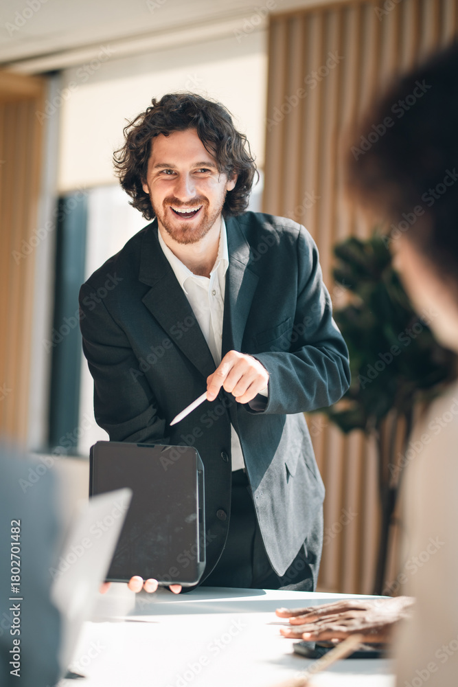 Creative business team meeting with professionals discussing project strategy, presenting ideas on board, teamwork collaboration concept in modern office environment #1802701482