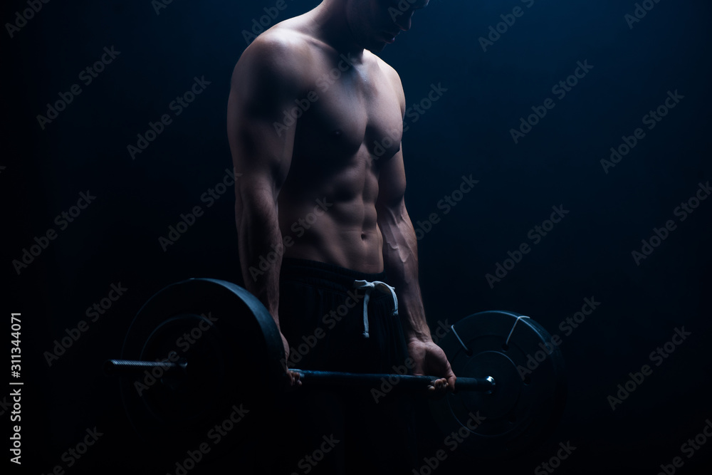cropped view of muscular bodybuilder with bare torso excising with barbell on black background #311344071