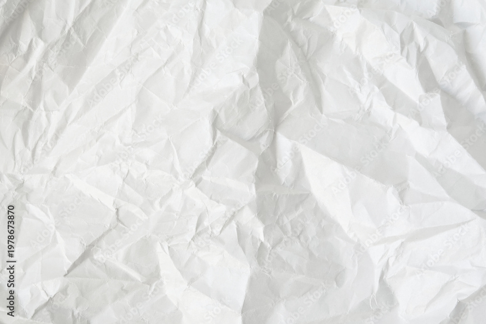 Crumpled white paper texture with detailed folds and shadows, perfect for abstract backgrounds, design overlays, and creative surface effects. #1978673870