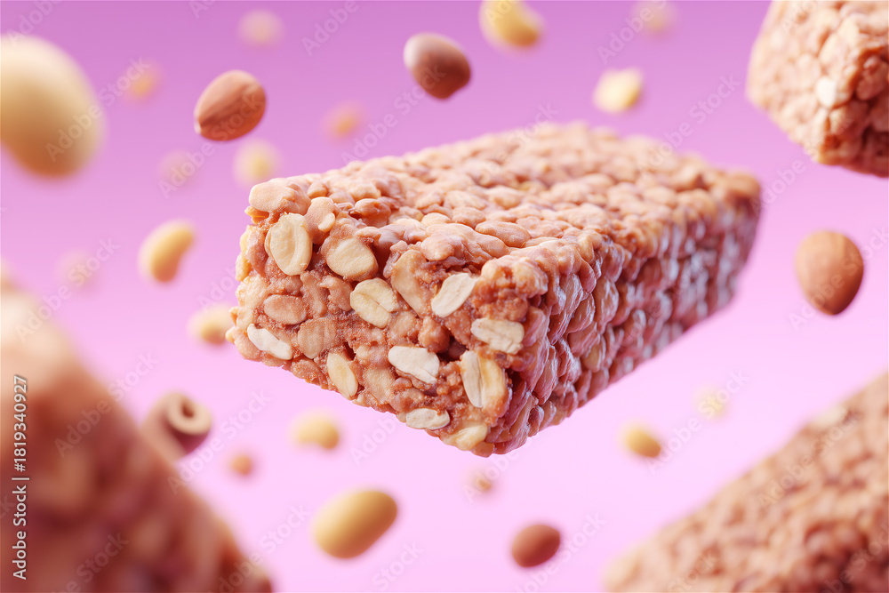 Crunchy peanut granola bar floating among scattered nuts on a vibrant pink background, showcasing sweet snack energy, modern advertising style and healthy on-the-go nutrition. #1819340927