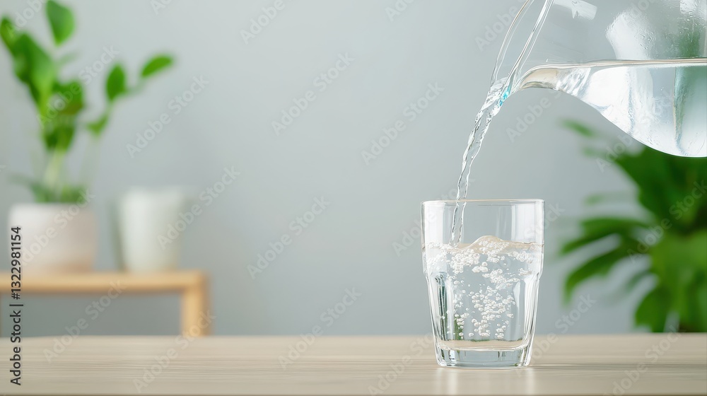 Crystal-clear water pouring from a pitcher into a glass creating beautiful ripples and reflections in the liquid #1322981154