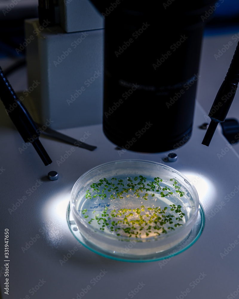 Culture in a petri dish under a light stereomicroscope is examined for pharmaceutical bioscience research. Concept of science, laboratory and study of diseases. Coronavirus (COVID-19) #331947650